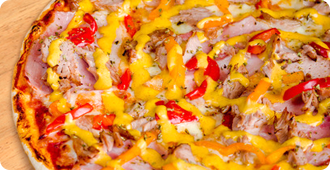 Curry tomātu mērce, siers, bekons, sautēta cūkgaļa, marinēta paprika, karija-mango mērce