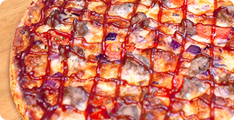 BBQ tomātu mērce, siers, malta cūkgaļa, sarkanie sīpoli, ķiršu tomātiņi, BBQ mērce