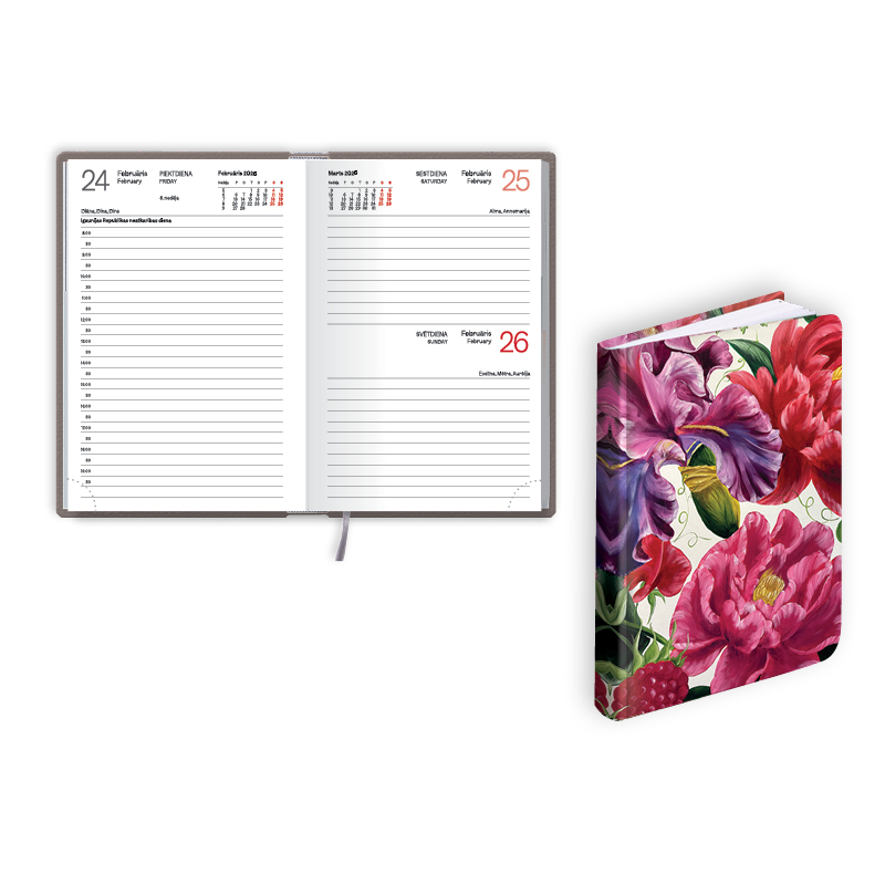 • Izmērs:98 x 150 mm • Viena diena lappusē • Valoda: Latviešu, angļu • FSC sertificēts papīrs,stūru perforācija, grāmatzīme • Latvijas karte pēclapā • krāsainie vāki