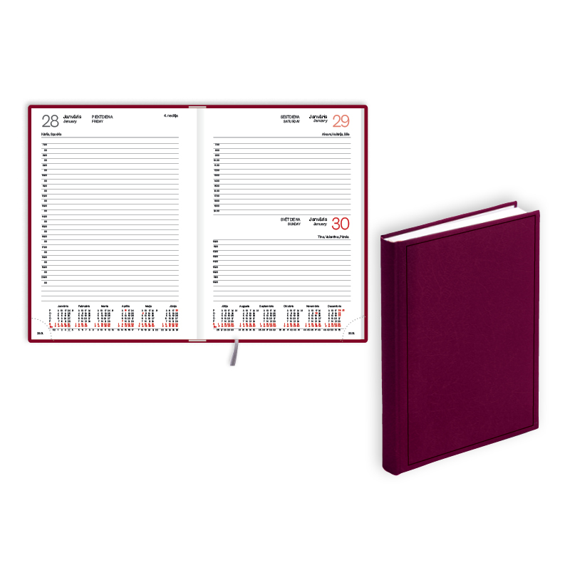 • Izmērs:142 mm x 205 mm • Viena diena lappusē • Divās valodās (latviešu, angļu) • FSC sertificēts papīrs, stūru perforācija • Balacron materiālam gadskaitļa uzspiedums uz muguriņas • Latvijas karte pēclapā • Polsterēts priekšējais vāks