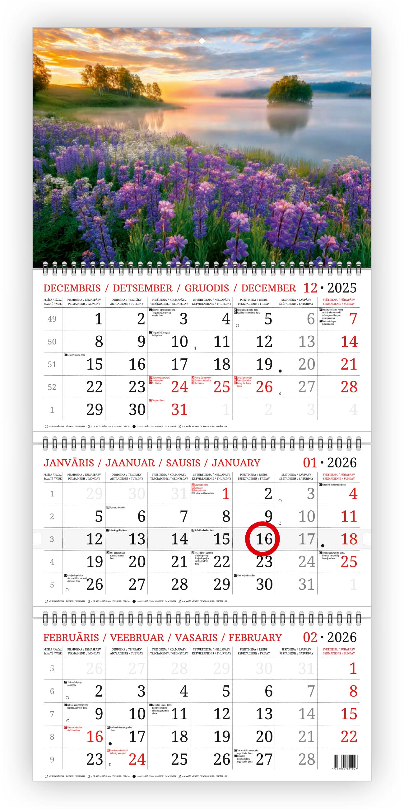 • Sienas kalendārs no 4 daļām • Ar krāsainu augšdaļu un trīs metāla spirālēm • Ar lodziņu datuma apzīmēšanai • Valoda: LV, LT, EE, EN • Iepakots PP maisiņā