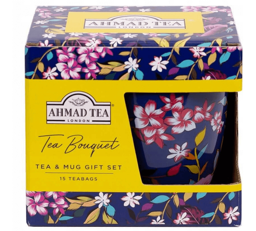 Komplektā ir 15 augstākās kvalitātes tējas maisiņi trīs dažādās šķirnēs: angļu brokastu tēja, zaļā tēja un citronu un ingvera uzlējums. Komplektā ir arī tumši zils krūze, kas rotāta ar ziedu akcentiem.